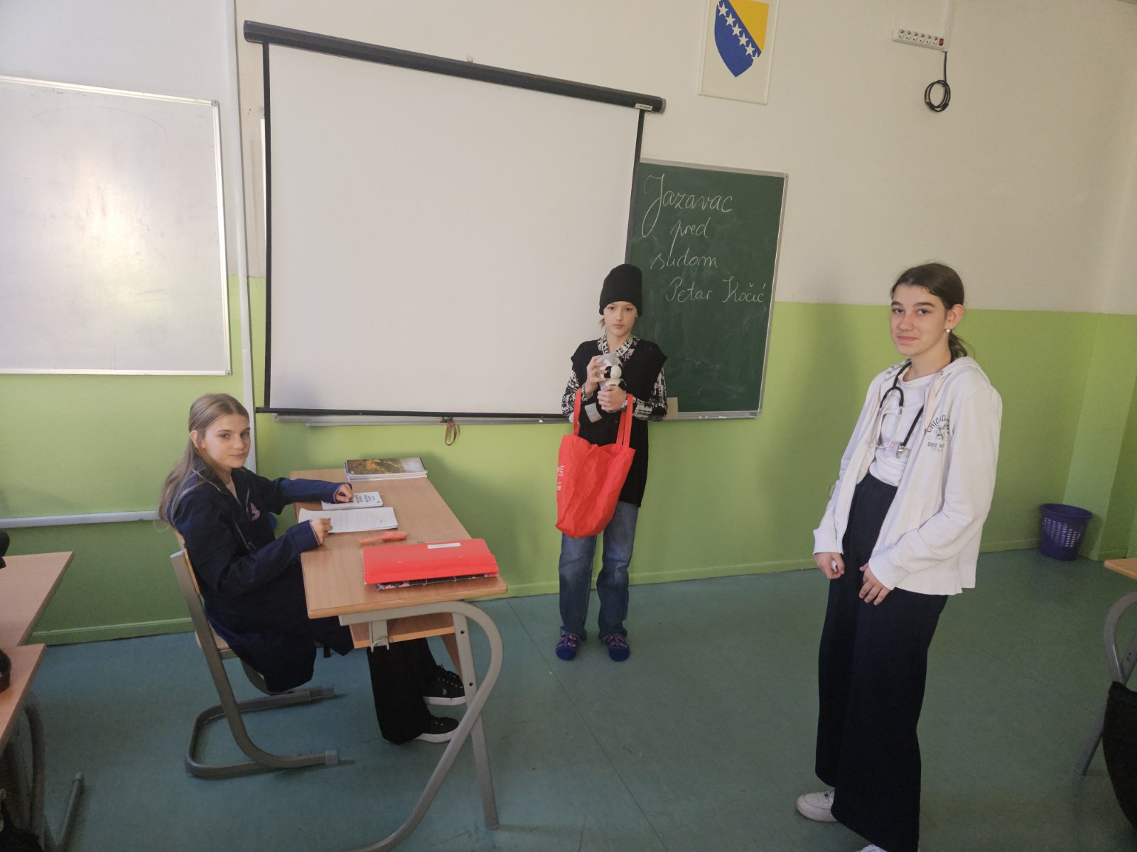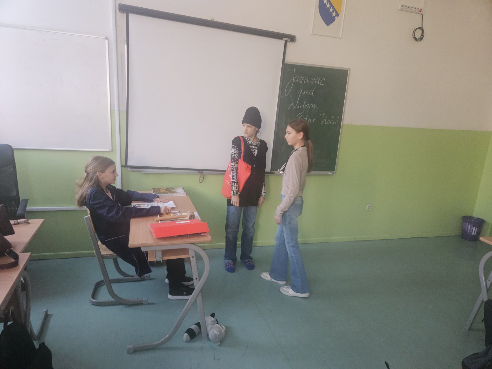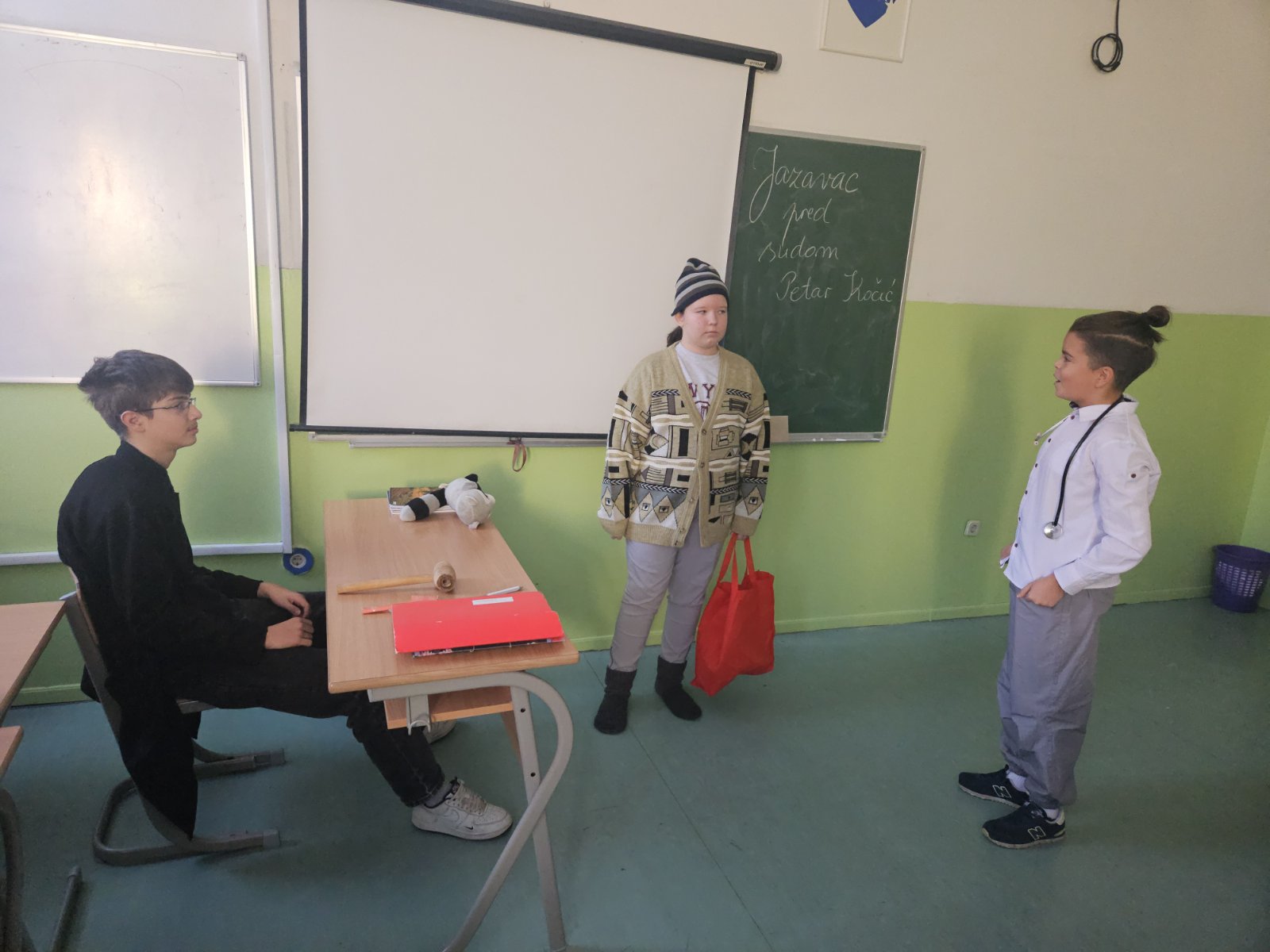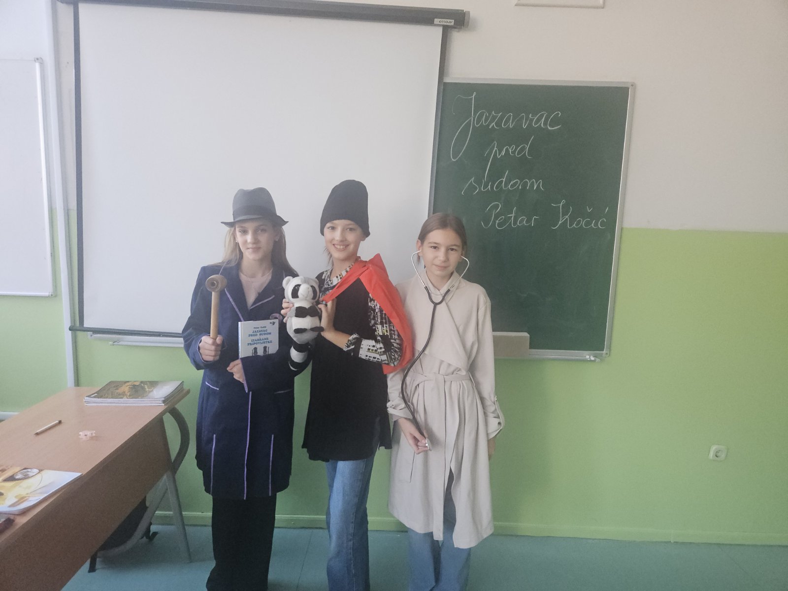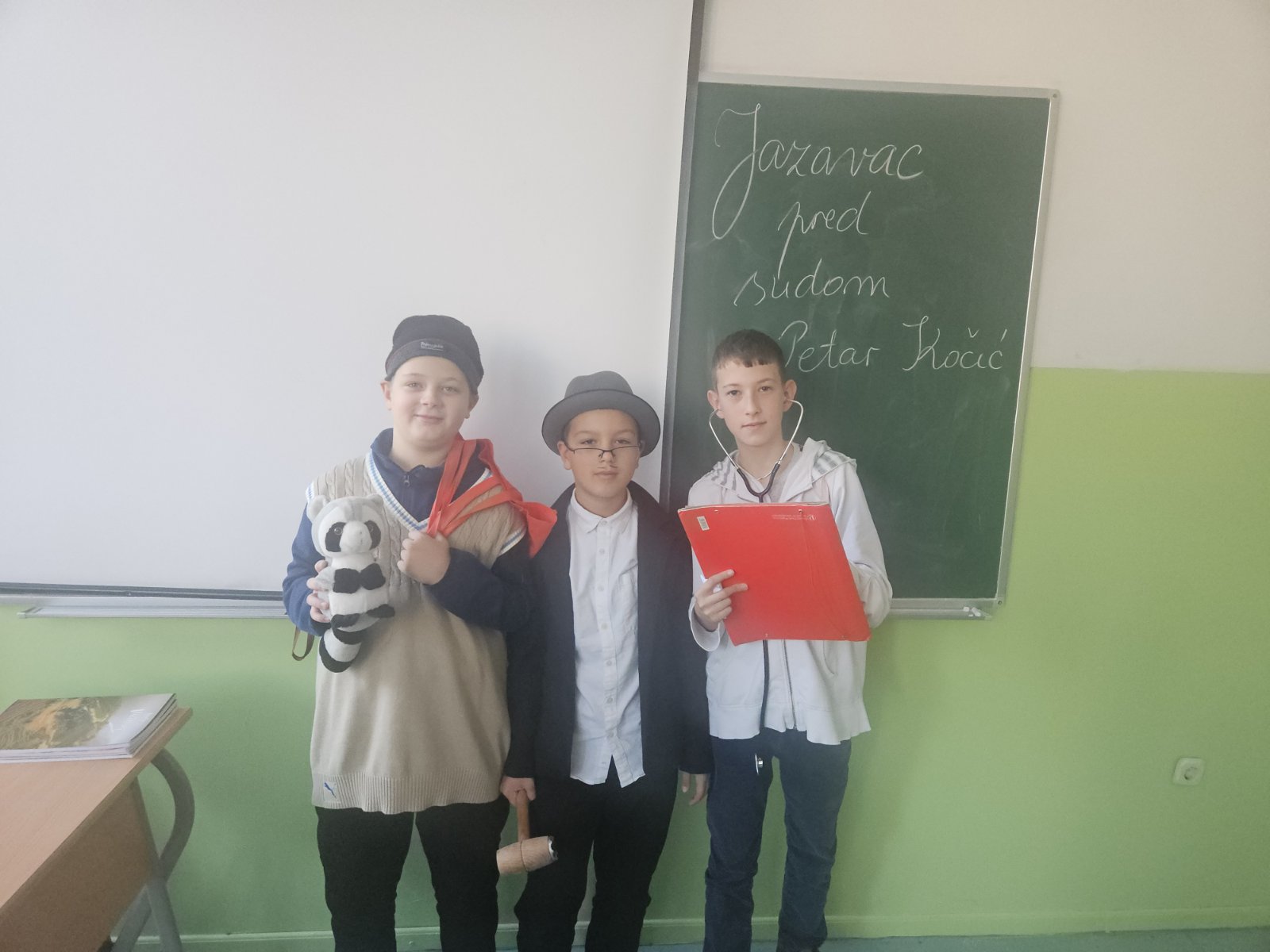 Na današnjem času lektire učenici VII-2 odjeljenja priredili su pravu pozorišnu predstavu prema drami „Jazavac pred sudom“ Petra Kočića. Uz mnogo entuzijazma, truda i kreativnosti oživjeli su poznate likove ovog satiričnog djela. Na sceni se pojavio i jazavac u vreći, ozbiljni i „velevažni“ sudija, zatim učen i nadmeni austrougarski doktor koji je, na veliko zadovoljstvo publike, neumorno miješao padeže, lica i vremena. Posebno se istakao nezaboravni i čuveni David Štrbac, čija je izvedba izazvala i smijeh i razmišljanje o nepravdi i apsurdu koje Kočićevo djelo prikazuje.Čas je protekao u izuzetno veseloj, angažovanoj i stvaralačkoj atmosferi. Učenici su pokazali da razumiju dubinu djela i vješto su prenijeli njegovu poruku kroz scenski prikaz.Posebno zadovoljstvo bilo je prisustvo naše pedagogice Elme, koja je, zajedno s razrednicom VII-2 razreda i ostalim učenicima, uživala u publici i nagradila izvođače velikim aplauzom.Ovaj čas bio je pravi primjer kreativnog pristupa lektiri — učenici su kroz glumu, humor i timski rad pokazali da književnost može biti živa, zabavna i inspirativna.